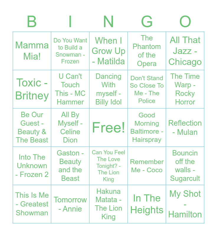 This bingo card has a free space and 45 words: Alexander Hamilton - Hamilton, My Shot - Hamilton, Defying Gravity - Wicked, This Is Me - Greatest Showman, Hello! - Book of Mormon, In The Heights, When I Grow Up - Matilda, One Day More - Les Miserables, All That Jazz - Chicago, Tomorrow - Annie, The Phantom of the Opera, Good Morning Baltimore - Hairspray, Can You Feel The Love Tonight? - The Lion King, Gaston - Beauty and the Beast, Under The Sea - The Little Mermaid, Hakuna Matata - The Lion King, You And Me (But Mostly Me) Book of Mormon, Be Our Guest - Beauty & The Beast, Love Is An Open Door - Frozen, The Time Warp - Rocky Horror, Do You Want to Build a Snowman - Frozen, The Origin of Love - Hedwig and the Angry Inch, Wicked Little Town - Hedwig and the Angry Inch, Mamma Mia!, Seasons of Love - Rent, Reflection - Mulan, A Whole New World - Aladdin, I'd Give My Life For You - Miss Saigon, Remember Me - Coco, Into The Unknown - Frozen 2, Friend Like Me - Aladdin, Bouncin off the walls - Sugarcult, On My own - Les Miserables, eleanor rigby The Beatles, Joy Division - Isolation, All By Myself - Celine Dion, I Wanna Dance With Somebody - Whitney, Heartbreak Hotel - Elvis, Dancing On My Own - Robyn, Dancing With myself - Billy Idol, Toxic - Britney, Don't Stand So Close To Me - The Police, Stayin Alive - The Bee Gees, U Can't Touch This - MC Hammer and Dancing in the dark - Bruce Springsteen.