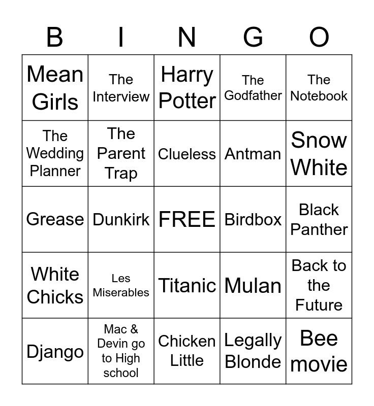 This bingo card has a free space and 24 words: Les Miserables, Mac & Devin go to High school, Clueless, Django, The Notebook, Mean Girls, The Wedding Planner, The Interview, Birdbox, Titanic, Antman, Grease, Mulan, Back to the Future, The Parent Trap, Legally Blonde, Black Panther, Harry Potter, Snow White, Dunkirk, Bee movie, White Chicks, The Godfather and Chicken Little.