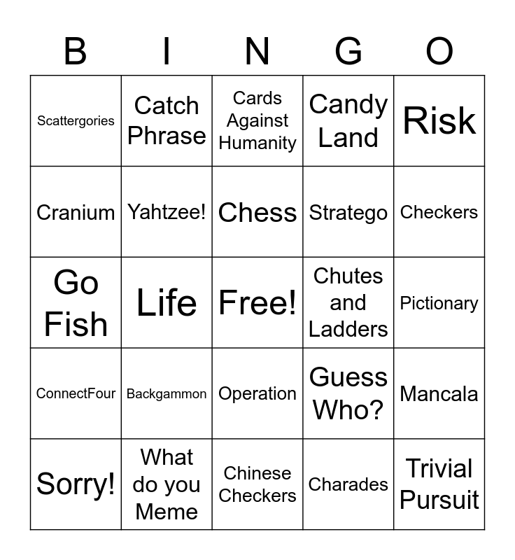 This bingo card has a free space and 39 words: Monopoly, Clue, Uno, Yahtzee!, Sorry!, Operation, Chess, Scrabble, Risk, ConnectFour, Life, Candy Land, Trivial Pursuit, Pictionary, Chutes and Ladders, Backgammon, BattleShip, Scattergories, Jenga, Guess Who?, Cranium, Chinese Checkers, Stratego, Checkers, Twister, Hungry Hungry Hippos, Mouse Trap, Dominoes, Trouble, Catch Phrase, Taboo, Cribbage, Cards Against Humanity, What do you Meme, Charades, Old Maid, Mancala, Go Fish and Mouse Trap.