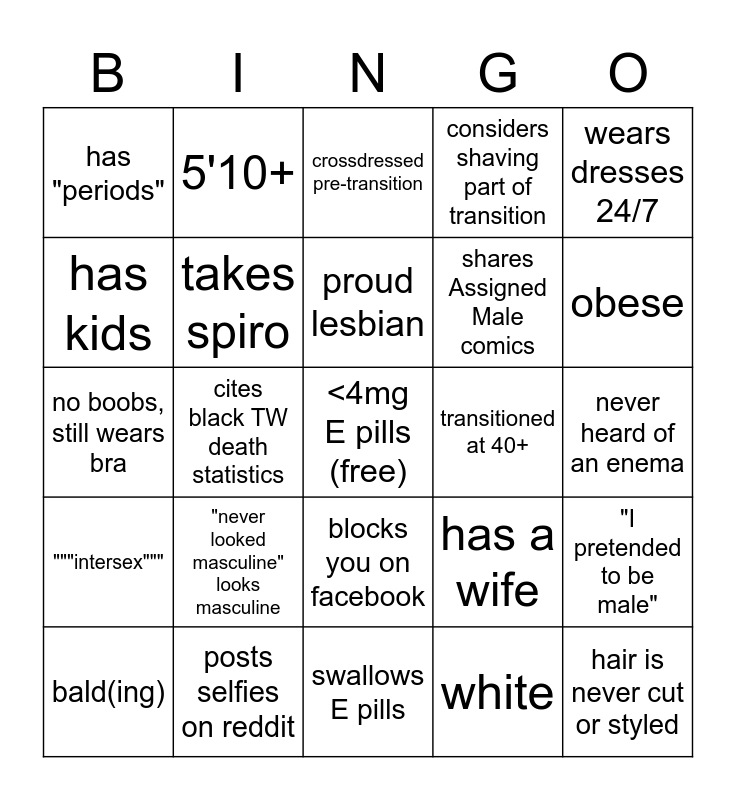 This bingo card has a free space and 24 words: "never looked masculine" looks masculine, posts selfies on reddit, proud lesbian, bald(ing), wears dresses 24/7, has "periods", has kids, 5'10+, transitioned at 40+, blocks you on facebook, shares Assigned Male comics, no boobs, still wears bra, has a wife, "I pretended to be male", takes spiro, white, never heard of an enema, crossdressed pre-transition, obese, cites black TW death statistics, hair is never cut or styled, """intersex""", considers shaving part of transition and swallows E pills.