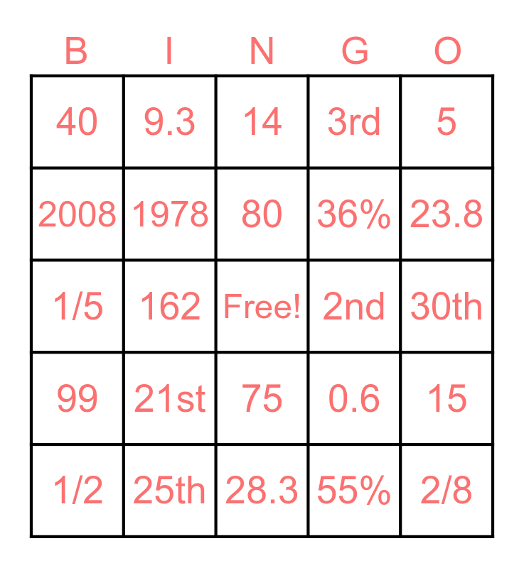 This bingo card has a free space and 40 words: 100, 1/5, 1010, 1978, 25th, 75, 80, 18, 5, 99, 162, 3rd, 2/8, 30th, 2nd, 21st, 92nd, 40, 50, 14, 15, 55%, 36%, 2008, 2000, 3045, 3014, 2050, 108, 118, 1/4, 1/2, 1/3, 0.6, 23.8, 28.3, 0.60, 0.16, 9.3 and 3.9.