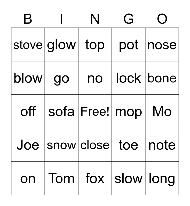 This bingo card has a free space and 24 words: snow, Tom, no, on, nose, stove, blow, glow, mop, close, lock, off, toe, note, go, slow, Mo, top, bone, sofa, long, Joe, pot and fox.