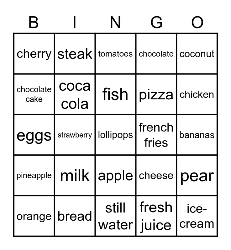 This bingo card has a free space and 24 words: milk, bread, fish, orange, coconut, cherry, chocolate cake, steak, french fries, apple, pizza, eggs, cheese, pear, coca cola, fresh juice, bananas, tomatoes, chicken, strawberry, ice-cream, pineapple, chocolate and still water.