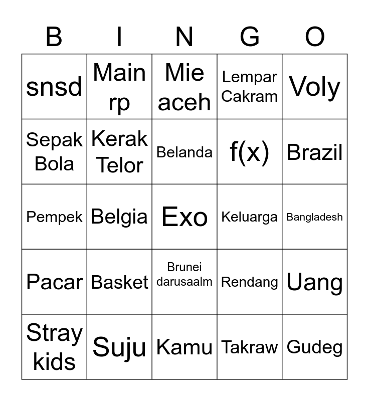 This bingo card has a free space and 24 words: Basket, Suju, Belanda, Stray kids, Voly, snsd, Sepak Bola, Main rp, Keluarga, Brunei darusaalm, f(x), Pempek, Rendang, Uang, Kerak Telor, Takraw, Bangladesh, Mie aceh, Brazil, Belgia, Gudeg, Pacar, Lempar Cakram and Kamu.