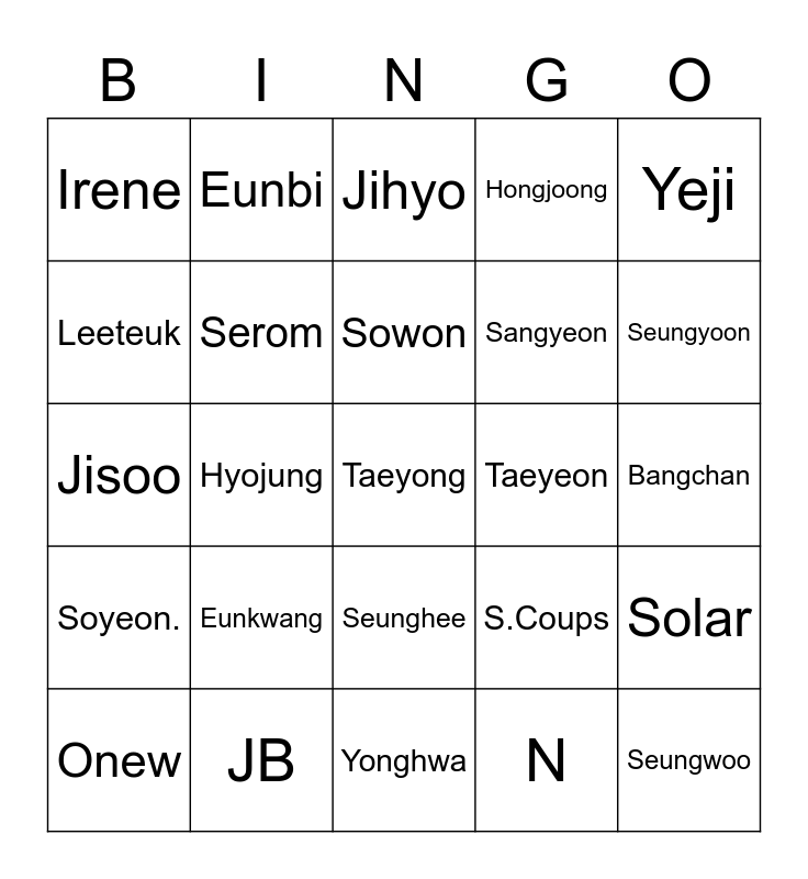 This bingo card has 25 words: Eunkwang, Yonghwa, Sowon, Onew, Yeji, Irene, Leeteuk, Eunbi, Taeyeon, Seunghee, Sangyeon, Jisoo, S.Coups, Solar, Serom, Seungwoo, Bangchan, Jihyo, Seungyoon, Hyojung, Taeyong, JB, Soyeon., Hongjoong and N.