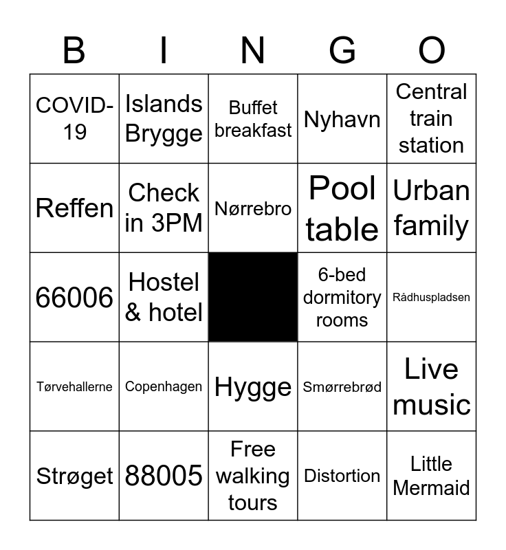 This bingo card has a free space and 29 words: Strøget, MEININGER, Hostel & hotel, Bike rental, COVID-19, Buffet breakfast, Check in 3PM, Copenhagen, 6-bed dormitory rooms, 88005, Rådhuspladsen, Little Mermaid, Free walking tours, Distortion, Urban family, Leave an online review! :), Hygge, Tørvehallerne, Central train station, 66006, Smørrebrød, Coffee and muffins, Pool table, Reffen, Nyhavn, Islands Brygge, Live music, Nørrebro and Meat Packing District.