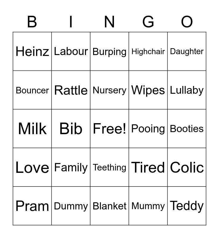 This bingo card has a free space and 30 words: Dummy, Nappy, Bib, Crying, Heinz, Burping, Rattle, Teething, Pooing, Blanket, Booties, Teddy, Mummy, Crawling, Lullaby, Midwife, Tired, Love, Family, Daughter, Milk, Stork, Labour, Wipes, Bouncer, Highchair, Colic, Pram, Nursery and Swaddle.