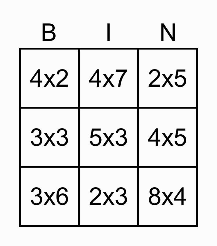 This bingo card has a free space and 17 words: 3x4, 2x8, 2x5, 4x2, 2x6, 3x3, 1x5, 3x6, 2x3, 4x5, 5x1, 7x3, 8x4, 4x7, 5x5, 4x6 and 3x9.