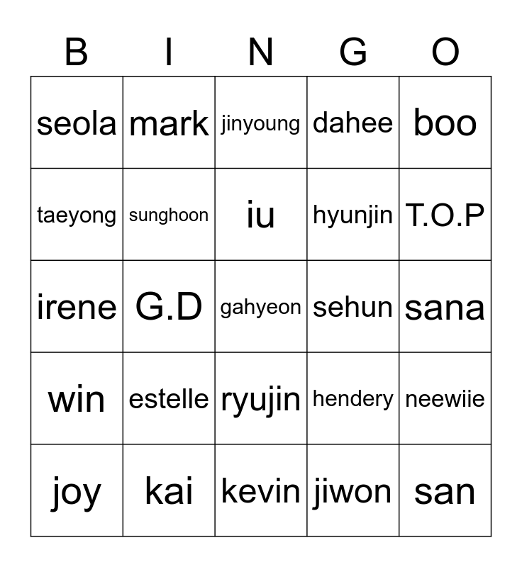 This bingo card has a free space and 24 words: estelle, kai, iu, joy, boo, seola, taeyong, mark, sehun, ryujin, hyunjin, irene, hendery, neewiie, sunghoon, jiwon, sana, jinyoung, T.O.P, G.D, san, win, dahee and kevin.