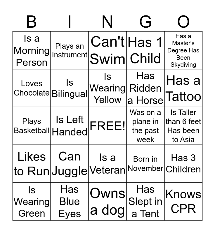 This bingo card has a free space and 30 words: Has Blue Eyes, Likes Spicy Food, Is Left Handed, Has 2 Children, Is a Morning Person, Can't Swim, Is Bilingual, Is a Veteran, Was on a plane in the past week, Owns a dog, Is Taller than 6 feet Has been to Asia, Knows CPR, Has Slept in a Tent, Born in Another Country Allergic to Cats, Has a Tattoo, Wears Contacts, Born in November, Likes to Run, Can Juggle, Has a Master's Degree Has Been Skydiving, Plays Basketball, Worked for Verizon Over 15 Years, Plays an Instrument, Has Ridden a Horse, Loves Chocolate, Has 1 Child, Has 3 Children, Is Wearing Green, Is Wearing Yellow and Has Been to Europe.