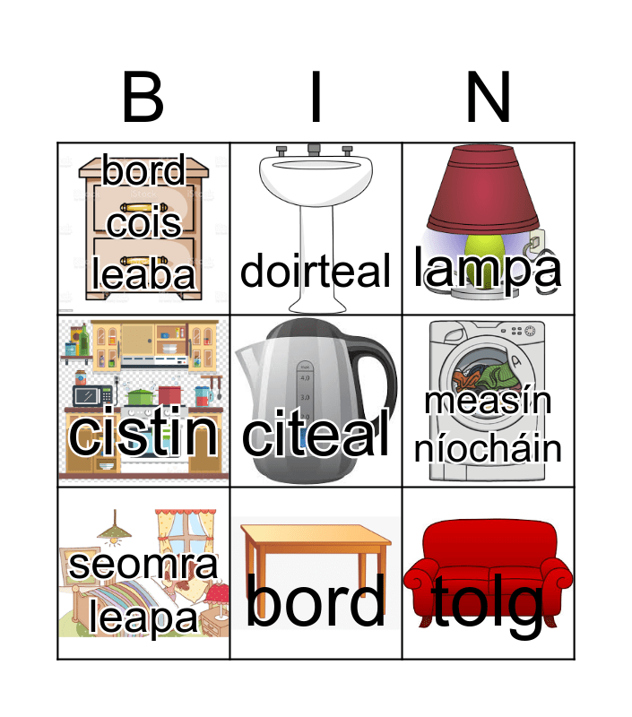 This bingo card has 23 images, a free space and 23 words: bréagáin, leithreas, bord, vardrús, tolg, bord cois leaba, measín níocháin, doirteal, scáthán, cuisneoir, seomra folctha, seomra fóntais, clog, leaba, oighean, folcadán, lampa, micreathonnán, seomra leapa, seomra suí, cistin, halla and teach.