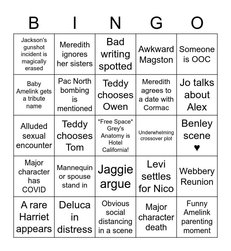 This bingo card has a free space and 24 words: Mannequin or spouse stand in, Deluca in distress, Teddy chooses Owen, A rare Harriet appears, Someone is OOC, Jackson's gunshot incident is magically erased, Baby Amelink gets a tribute name, Meredith ignores her sisters, Underwhelming crossover plot, Jaggie argue, Meredith agrees to a date with Cormac, Alluded sexual encounter, Levi settles for Nico, Webbery Reunion, Pac North bombing is mentioned, Major character death, Benley scene ♥️, Bad writing spotted, Jo talks about Alex, Teddy chooses Tom, Funny Amelink parenting moment, Major character has COVID, Awkward Magston and Obvious social distancing in a scene.