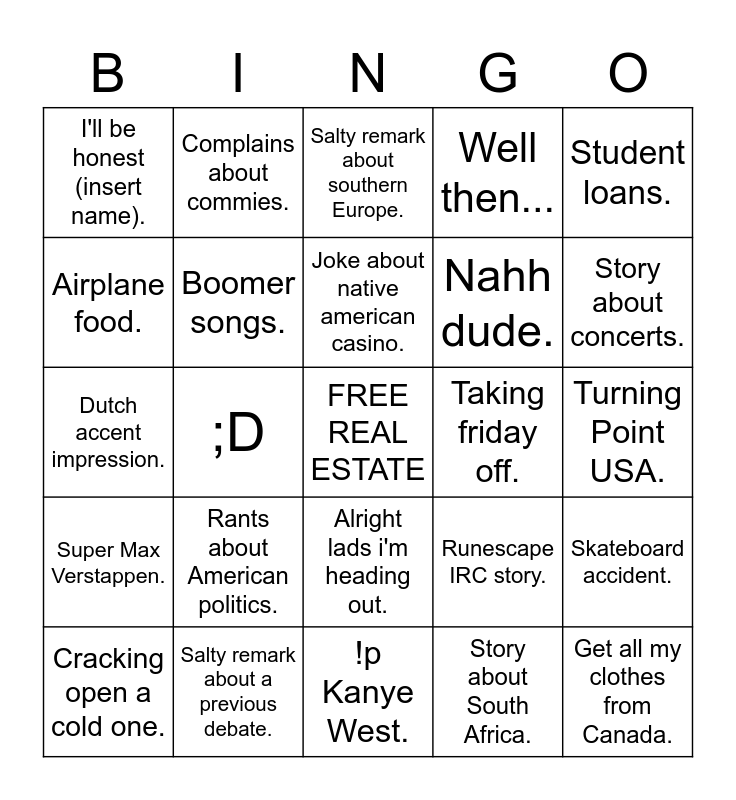 This bingo card has a free space and 35 words: Story about work., A friend who works in Belgium., Twisted bow., Boomer songs., Alright lads i'm heading out., Well then..., Airplane food., Car football with a friend., Joke about native american casino., Rants about the Supreme Court., Dutch accent impression., Student loans., Haven't ordered food in a while., Repeating an old story., I'll be honest (insert name)., Taking friday off., Story about South Africa., ;D, Super Max Verstappen., Get all my clothes from Canada., Runescape IRC story., Cracking open a cold one., Skateboard accident., Salty remark about a previous debate., Salty remark about southern Europe., Story about concerts., Complain about Mercedes dominance., Ferrari bad meme., Nahh dude., Turning Point USA., Complain about Sweden., !p Kanye West., Rants about American politics., Complains about commies. and References to something German..