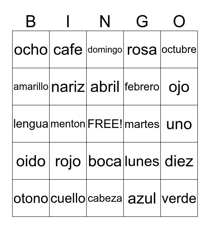 This bingo card has a free space and 24 words: rojo, cuello, abril, otono, octubre, ocho, amarillo, cafe, martes, boca, febrero, lengua, lunes, diez, nariz, azul, uno, domingo, ojo, menton, verde, oido, rosa and cabeza.