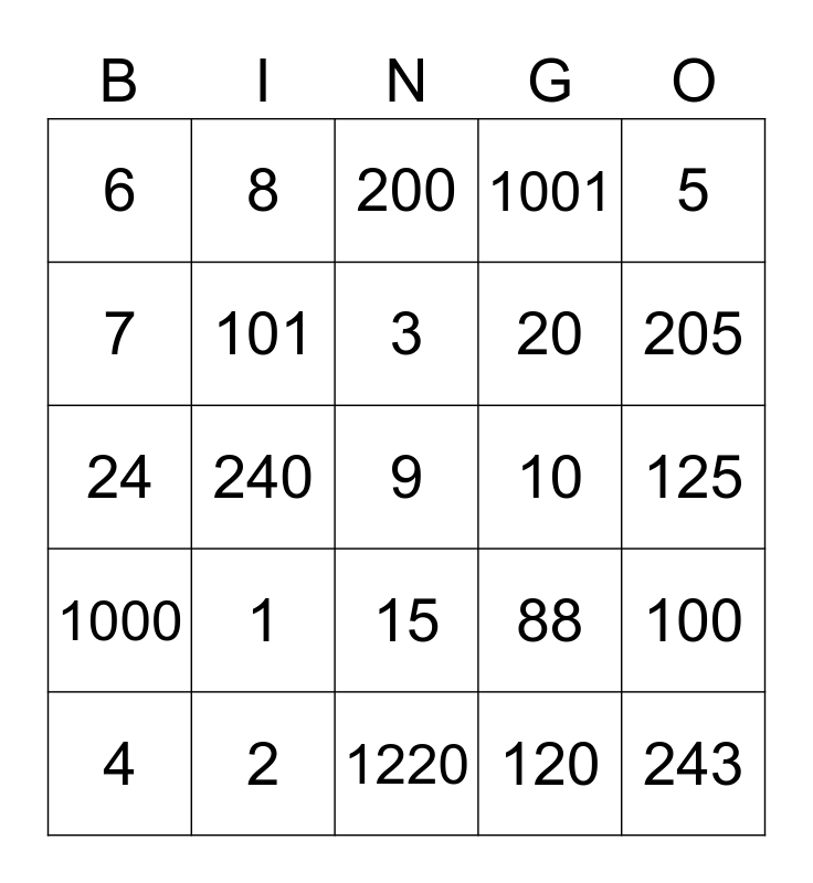 This bingo card has a free space and 24 words: 1, 2, 3, 4, 5, 6, 7, 8, 10, 15, 20, 24, 88, 100, 101, 120, 125, 200, 205, 240, 243, 1000, 1001 and 1220.