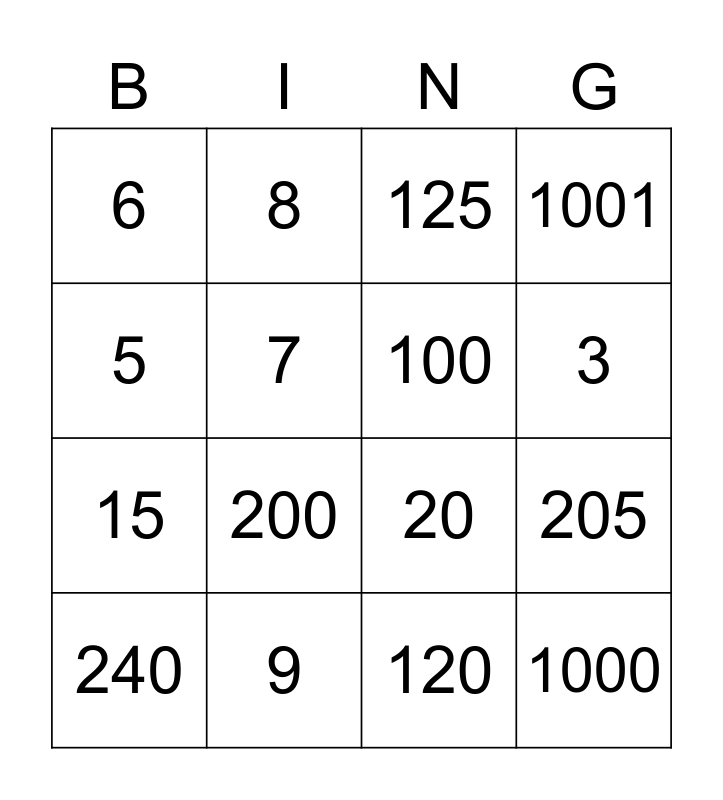 This bingo card has 25 words: 1, 2, 3, 4, 5, 6, 7, 8, 9, 10, 15, 20, 24, 88, 100, 101, 120, 125, 200, 205, 240, 243, 1000, 1001 and 1220.