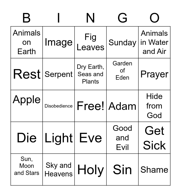This bingo card has a free space and 24 words: Light, Sky and Heavens, Dry Earth, Seas and Plants, Sun, Moon and Stars, Animals in Water and Air, Animals on Earth, Rest, Image, Adam, Eve, Garden of Eden, Apple, Good and Evil, Get Sick, Serpent, Sin, Hide from God, Fig Leaves, Prayer, Disobedience, Shame, Die, Sunday and Holy.