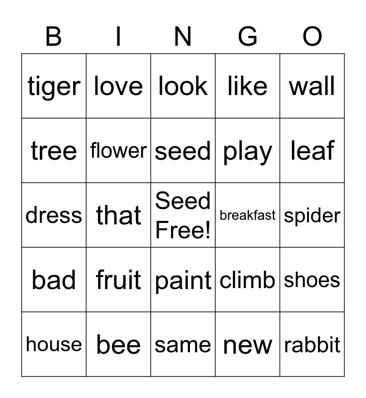 This bingo card has a free space and 39 words: this, bed, hat, flower, house, paint, seed, frog, wall, bad, that, like, rabbit, spider, breakfast, fruit, bread, tiger, look like, climb, tree, same, play, leaf, friend, sing, jump, fly, cricket, love, camera, photo, look, bee, new, sox, shoes, dress and home.