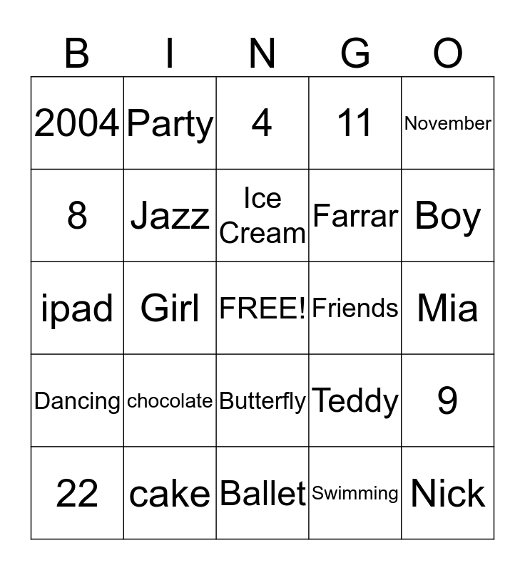 This bingo card has a free space and 24 words: chocolate, cake, Ice Cream, 22, November, 2004, 8, Party, Friends, Butterfly, Farrar, ipad, Teddy, 9, Jazz, Swimming, Mia, 4, Boy, Girl, Nick, Dancing, 11 and Ballet.