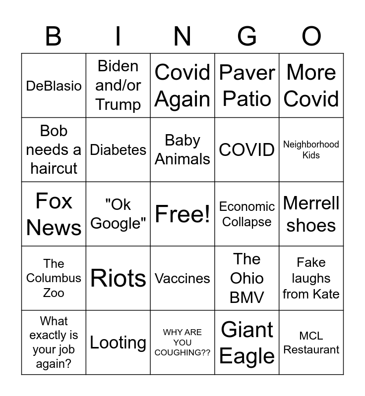 This bingo card has a free space and 24 words: Riots, Looting, Baby Animals, What exactly is your job again?, More Covid, DeBlasio, Bob needs a haircut, Biden and/or Trump, Economic Collapse, Vaccines, COVID, Fox News, The Ohio BMV, Fake laughs from Kate, Diabetes, Giant Eagle, Merrell shoes, Covid Again, Neighborhood Kids, "Ok Google", MCL Restaurant, The Columbus Zoo, Paver Patio and WHY ARE YOU COUGHING??.