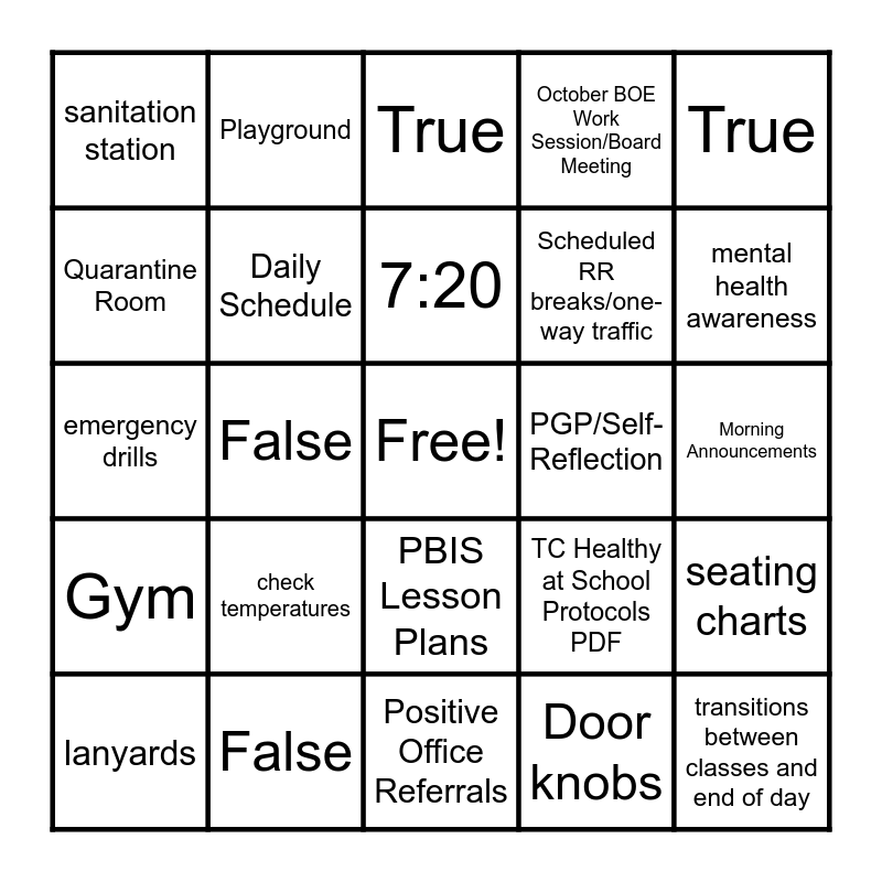 This bingo card has a free space and 24 words: check temperatures, False, 7:20, lanyards, True, sanitation station, Quarantine Room, Playground, PGP/Self- Reflection, PBIS Lesson Plans, Scheduled RR breaks/one-way traffic, emergency drills, TC Healthy at School Protocols PDF, seating charts, Daily Schedule, Door knobs, Morning Announcements, True, mental health awareness, False, transitions between classes and end of day, Gym, October BOE Work Session/Board Meeting and Positive Office Referrals.