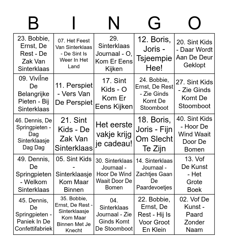 This bingo card has a free space and 50 words: 01. Gerard Joling, Diego - Ik Kan Niet Wachten, 02. Vof De Kunst - Paard Zonder Naam, 03. Djumbo - Ik Word Later Zwartepiet, 04. Sinterklaas Journaal - Zie Ginds Komt De Stoomboot, 05. Sint Kids - Sinterklaasje Kom Maar Binnen, 06. Fifty Sint, Snoepje Pietje Piet - Doe Maar Lekker Mee, 07. Het Feest Van Sinterklaas - De Sint Is Weer In Het Land, 08. De Pieten Boyband Spotlight, Feestpieten - Sint Maakt Ons Gek - Origineel, 09. ViviÎne De Belangrijke Pieten - Bij Sinterklaas, 10. Diego - Slaap Lekker Lieve Sint, 11. Perspiet - Vers Van De Perspiet, 12. Boris, Joris - Tsjeempie Hee!, 13. Vof De Kunst - Het Grote Boek, 14. Sinterklaas Journaal - Zachtjes Gaan De Paardevoetjes, 15. Sinterklaas Journaal - Sinterklaas Kapoentje, 16. Sint Kids - Sinterklaas Boot - Boten Anna, 17. Sint Kids - O Kom Er Eens Kijken, 18. Boris, Joris - Fijn Om Slecht Te Zijn, 19. Vof De Kunst - Binnenstevoren, Achterstebuiten, 20. Sint Kids - Daar Wordt Aan De Deur Geklopt, 21. Sint Kids - De Zak Van Sinterklaas, 22. Bobbie, Ernst, De Rest - Hij Is Voor Groot En Klein, 23. Bobbie, Ernst, De Rest - De Zak Van Sinterklaas, 24. Bobbie, Ernst, De Rest - Zie Ginds Komt De Stoomboot, 25. Bobbie, Ernst, De Rest - Zwarte Piet Ging Uit Fietsen, 26. Vof De Kunst - Hoor Ik Paardenvoetjes, 27. Sint Kids - Zie Ginds Komt De Stoomboot, 28. Djumbo - Dansen Op Het Dak, 29. Sinterklaas Journaal - O, Kom Er Eens Kijken, 30. Sinterklaas Journaal - Hoor De Wind Waait Door De Bomen, 31. Sinterklaas Journaal - Dag Sinterklaasje, 32. Bobbie, Ernst, De Rest - Zie De Maan Schijnt Door De Bomen, 33. Bobbie, Ernst, De Rest - Wie Zijn Hier De Baas, 34. Bobbie, Ernst, De Rest - Wie Zijn Hier De Baas (Deel 2), 35. Bobbie, Ernst, De Rest - Sinterklaasje Kom Maar Binnen Met Je Knecht, 36. Vof De Kunst - De Centrale Verwarming, 37. Sint Kids - Ik Ben Toch Zeker Sinterklaas Niet, 38. Sint Kids - Hop, Hop, Hop, 39. Sint Kids - Hoor Wie Klopt Daar Kinderen, 40. Sint Kids - Hoor De Wind Waait Door De Bomen, 41. Feestpieten - Sint Is Cool, Piet Is Vet, 42. Dennis, De Springpieten - Sinterklaas Is Jarig, 43. Dennis, De Springpieten - Zachtjes Gaan De Paardenvoetjes, 44. Dennis, De Springpieten - Zie De Maan Schijnt Door De Bomen, 45. Dennis, De Springpieten - Paniek In De Confettifabriek, 46. Dennis, De Springpieten - Dag Sinterklaasje Dag Dag, 47. Dennis, De Springpieten - Hij Komt, Hij Komt, 48. Dennis, De Springpieten - Daar Wordt Aan De Deur Geklopt, 49. Dennis, De Springpieten - Welkom Sinterklaas and 50. Dennis, De Springpieten - Het Paard Van Sinterklaas Is Ziek.