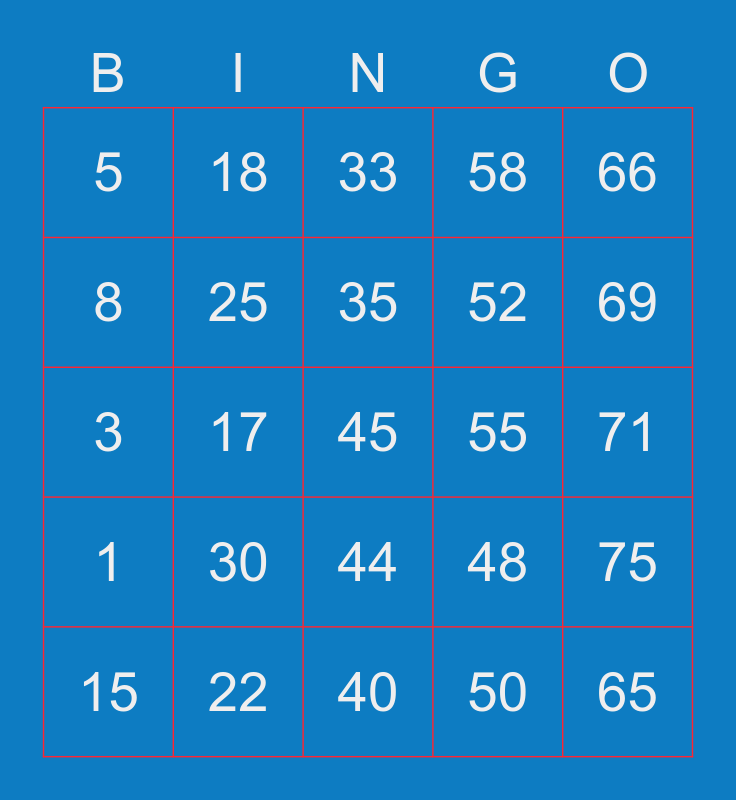 This bingo card has 25 words: 1, 22, 45, 50, 66, 5, 18, 33, 55, 75, 8, 25, 40, 48, 69, 15, 17, 35, 52, 71, 3, 30, 44, 58 and 65.