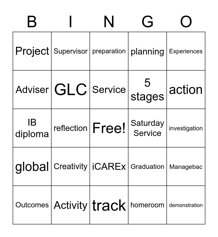 This bingo card has a free space and 24 words: Creativity, Activity, Service, Outcomes, Experiences, Project, Adviser, Supervisor, Saturday Service, iCAREx, 5 stages, IB diploma, Graduation, Managebac, GLC, homeroom, investigation, preparation, action, reflection, demonstration, global, planning and track.