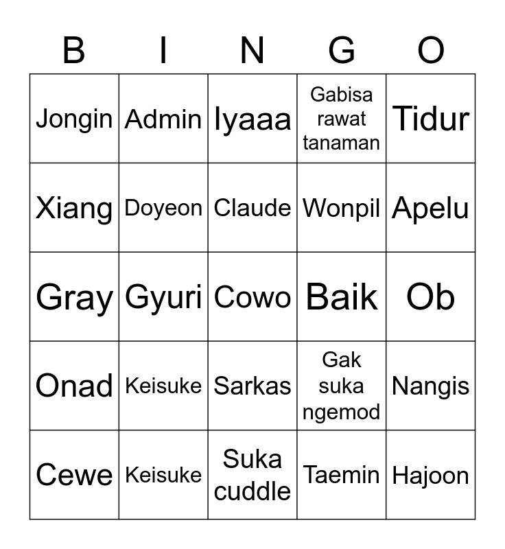 This bingo card has a free space and 24 words: Keisuke, Keisuke, Claude, Cewe, Tidur, Jongin, Xiang, Admin, Baik, Sarkas, Wonpil, Gray, Gak suka ngemod, Nangis, Doyeon, Taemin, Ob, Iyaaa, Apelu, Gyuri, Hajoon, Onad, Gabisa rawat tanaman and Suka cuddle.
