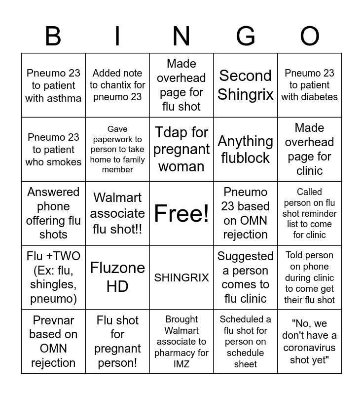 This bingo card has a free space and 24 words: Fluzone HD, Flu shot for pregnant person!, Tdap for pregnant woman, Prevnar based on OMN rejection, Pneumo 23 to patient with diabetes, Pneumo 23 to patient with asthma, Pneumo 23 to patient who smokes, Added note to chantix for pneumo 23, Pneumo 23 based on OMN rejection, SHINGRIX, Anything flublock, Answered phone offering flu shots, Suggested a person comes to flu clinic, Told person on phone during clinic to come get their flu shot, Gave paperwork to person to take home to family member, Scheduled a flu shot for person on schedule sheet, Called person on flu shot reminder list to come for clinic, Made overhead page for flu shot, Made overhead page for clinic, Walmart associate flu shot!!, "No, we don't have a coronavirus shot yet", Flu +TWO (Ex: flu, shingles, pneumo), Second Shingrix and Brought Walmart associate to pharmacy for IMZ.