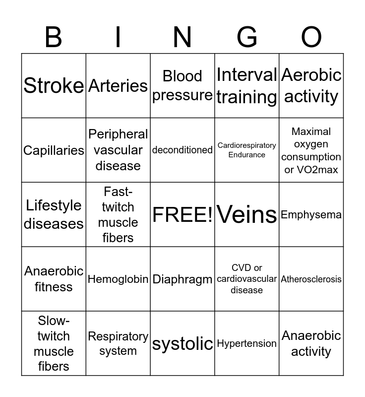 This bingo card has a free space and 24 words: Hemoglobin, Respiratory system, deconditioned, Slow-twitch muscle fibers, Aerobic activity, Stroke, Capillaries, Arteries, Veins, Diaphragm, Cardiorespiratory Endurance, Lifestyle diseases, CVD or cardiovascular disease, Atherosclerosis, Peripheral vascular disease, Hypertension, Emphysema, Blood pressure, Maximal oxygen consumption or VO2max, Fast-twitch muscle fibers, Anaerobic activity, Anaerobic fitness, Interval training and systolic.