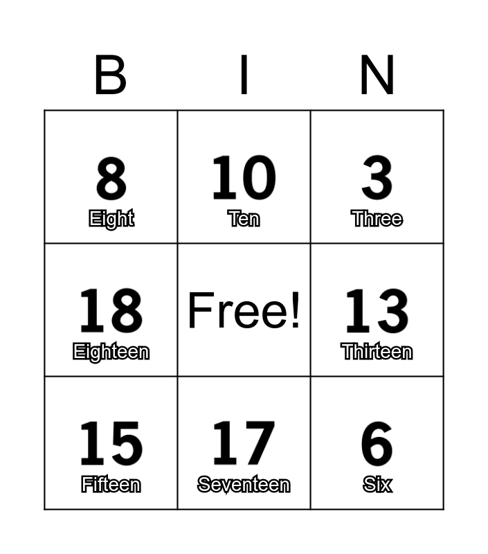 This bingo card has 20 images, a free space and 20 words: One, Two, Three, Four, Five, Six, Seven, Eight, Nine, Ten, Eleven, Twelve, Thirteen, Fourteen, Fifteen, Sixteen, Seventeen, Eighteen, Nineteen and Twenty.