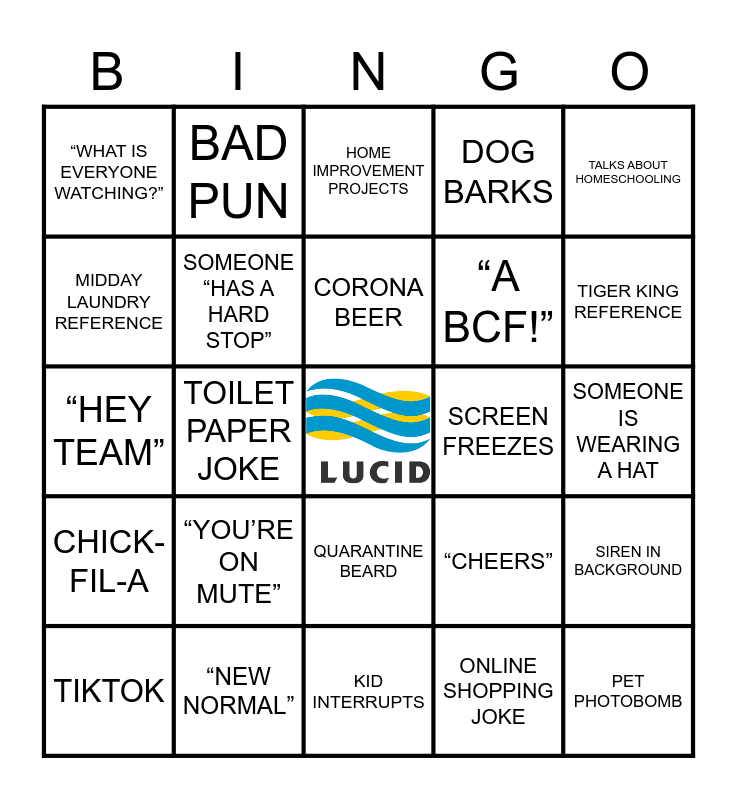 This bingo card has a free space and 48 words: SOMEONE IS SITTING OUTSIDE, PET PHOTOBOMB, KID PHOTOBOMB, KID INTERRUPTS, “YOU’RE ON MUTE”, JOKE ABOUT “THE COMMUTE”, BAD PUN, SOMEONE SAYS “THE COVID”, MIDDAY LAUNDRY REFERENCE, HOUSE PLANT IN BACKGROUND, SOMEONE “HAS A HARD STOP”, DOG BARKS, SIREN IN BACKGROUND, “CHEERS”, “STAY SAFE’”, SOMEONE IS WEARING HEADPHONES, CORONA BEER, SCREEN FREEZES, “GO AHEAD/YOU FIRST”, TALKS ABOUT HOMESCHOOLING, TOILET PAPER JOKE, ONLINE SHOPPING JOKE, “WHAT IS EVERYONE WATCHING?”, “A BCF!”, SOMEONE SHARES A MEME IN THE CHAT, TIGER KING REFERENCE, TIKTOK, REVENUE 606, QUARANTINE BEARD, CHICK-FIL-A, ‘WHAT ARE YOU DRINKING?”, COLLEGE FOOTBALL, MURDER HORNETS, HURRICANES, “NEW NORMAL”, JOKE ABOUT GAINING WEIGHT, “I MISS…”, SOMEONE IS WEARING A HAT, HAIRCUT JOKE, SOMEONE SWITCHES BACKGROUND, “JUST ALLERGIES”, “THE AUDITORS…”, HOME IMPROVEMENT PROJECTS, 5 O’CLOCK SOMEWHERE, “HEY TEAM”, HALLOWEEN, SPOUSE SAYS HI and NEXT YEAR’S VACATION.