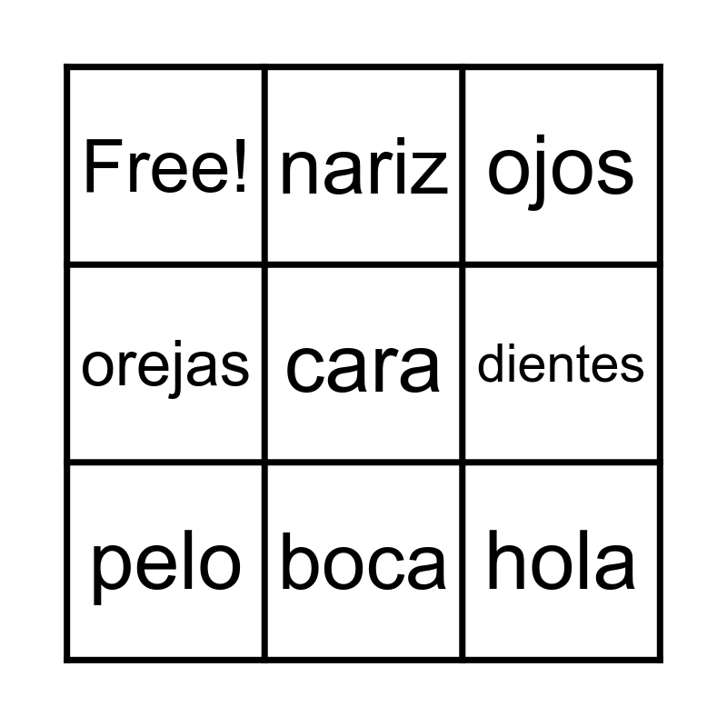 This bingo card has 9 words: pelo, ojos, nariz, orejas, Free!, dientes, cara, hola and boca.