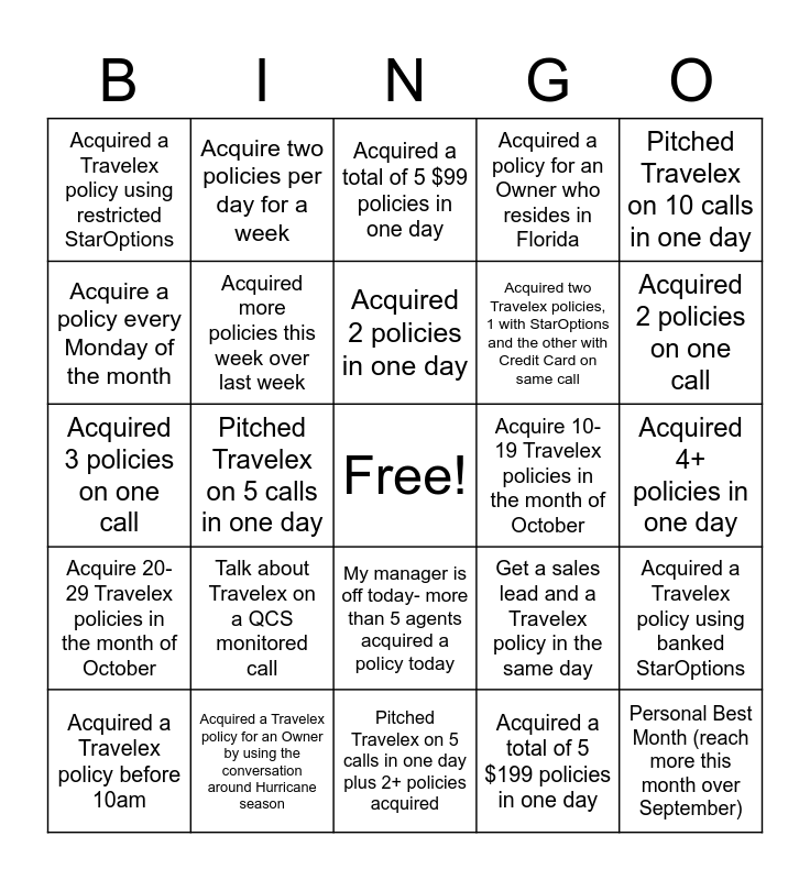 This bingo card has a free space and 29 words: Acquired 1 policy, Acquired a Travelex policy for an Owner by using the conversation around Hurricane season, Acquired a total of 5 $99 policies in one day, Acquired a Travelex policy before between 10am-12pm, Pitched Travelex on 10 calls in one day, Acquired a Travelex policy using restricted StarOptions, Acquired more policies this week over last week, Acquired 2 policies in one day, Acquire 10-19 Travelex policies in the month of October, Acquired a Travelex policy using banked StarOptions, Acquired a Travelex policy before 10am, Pitched Travelex on 5 calls in one day, Acquired a total of 5 $199 policies in one day, Personal Best Month (reach more this month over September), Acquired 3 policies on one call, Secured a Travelex policy for an Owner for 2021 or 2022 who already has a policy for 2020, Pitched Travelex on 5 calls in one day plus 2+ policies acquired, Get a sales lead and a Travelex policy in the same day, Acquired 2 policies on one call, Acquire 20-29 Travelex policies in the month of October, Talk about Travelex on a QCS monitored call, Acquired 3 policies in one day, Acquired two Travelex policies, 1 with StarOptions and the other with Credit Card on same call, Acquired 4+ policies in one day, Acquire a policy every Monday of the month, Acquire two policies per day for a week, My manager is off today- more than 5 agents acquired a policy today, Acquired a policy for an Owner who resides in Florida and dress up for Halloween and share the pic with your team.