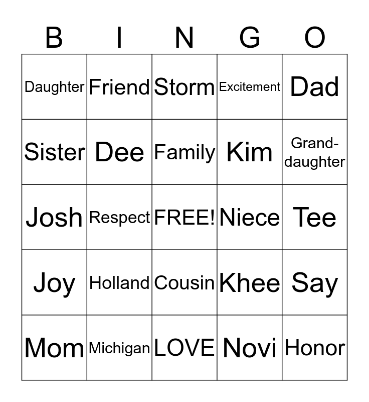 This bingo card has a free space and 24 words: Holland, Michigan, Family, Mom, Dad, Daughter, Sister, Friend, Niece, Cousin, Kim, Josh, Khee, Say, Dee, Novi, Tee, Storm, Grand-daughter, Respect, Honor, Joy, Excitement and LOVE.