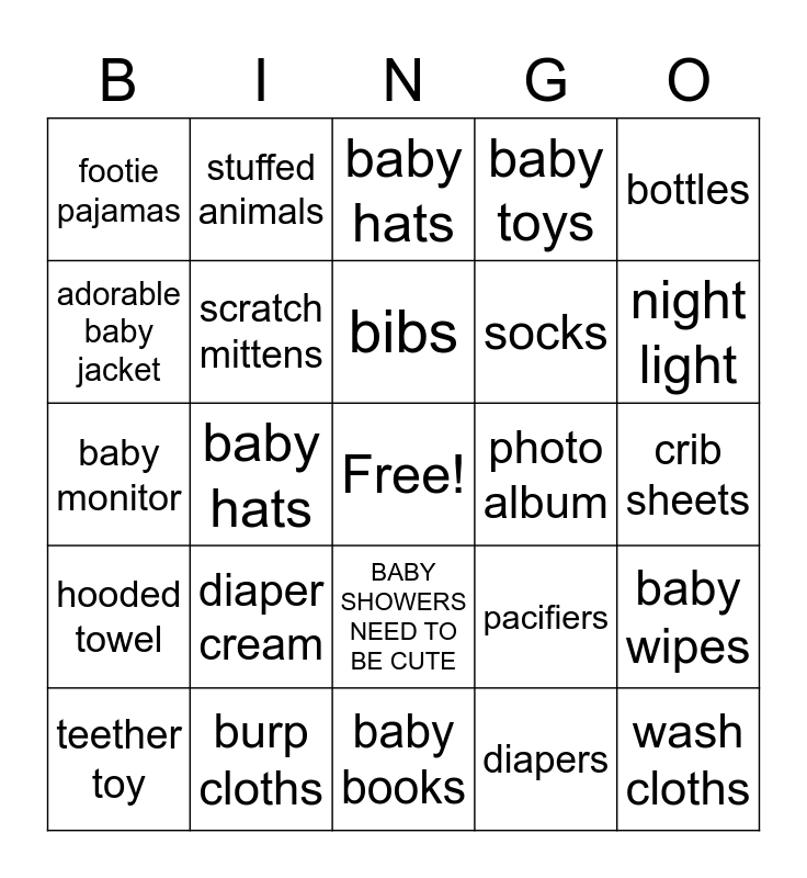 This bingo card has a free space and 26 words: BABY SHOWERS NEED TO BE CUTE, diapers, bibs, burp cloths, bottles, footie pajamas, adorable baby jacket, stuffed animals, crib sheets, pacifiers, socks, baby monitor, baby wipes, teether toy, baby hats, baby powder, baby toys, hooded towel, baby hats, wash cloths, night light, baby books, photo album, diaper cream, scratch mittens and onesies.