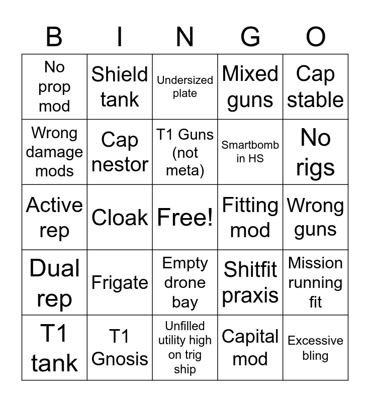 This bingo card has a free space and 25 words: Frigate, Unfilled utility high on trig ship, T1 Guns (not meta), T1 tank, Cap stable, No prop mod, Wrong damage mods, Shield tank, Fitting mod, Empty drone bay, Smartbomb in HS, Active rep, Shitfit praxis, Mission running fit, Cap nestor, Destroyer or smaller, Wrong guns, Undersized plate, No rigs, Cloak, Excessive bling, T1 Gnosis, Dual rep, Mixed guns and Capital mod.