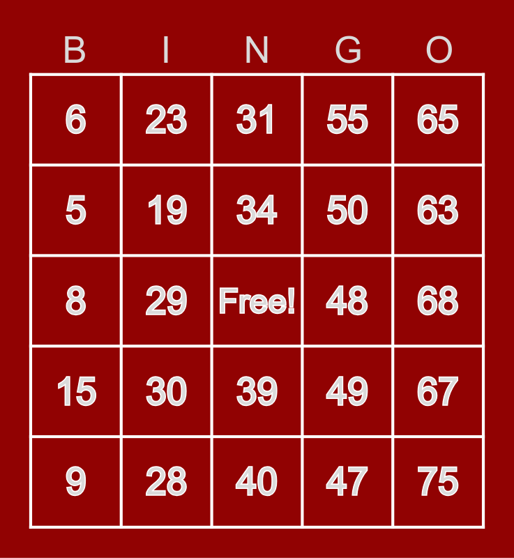 This bingo card has a free space and 75 words: 1, 16, 31, 46, 61, 2, 17, 32, 47, 62, 3, 18, 48, 63, 4, 19, 33, 49, 64, 5, 20, 34, 50, 65, 6, 21, 35, 51, 66, 7, 22, 36, 52, 67, 8, 23, 37, 53, 68, 9, 24, 38, 54, 69, 10, 25, 39, 55, 70, 11, 26, 40, 56, 71, 12, 27, 41, 57, 72, 13, 28, 42, 58, 73, 14, 29, 43, 59, 74, 15, 30, 44, 60, 75 and 45.
