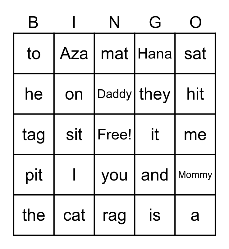 This bingo card has a free space and 29 words: the, and, sit, was, to, mat, on, I, it, cat, me, a, rag, is, hit, bat, you, pit, sat, tag, and, for, they, he, Hana, Aza, Mommy, Daddy and Akira.