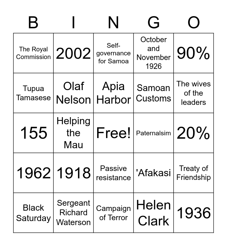 This bingo card has a free space and 24 words: 1918, Sergeant Richard Waterson, Apia Harbor, Black Saturday, 90%, The Royal Commission, Tupua Tamasese, 2002, Paternalsim, Passive resistance, Samoan Customs, 155, 'Afakasi, Treaty of Friendship, Olaf Nelson, Helen Clark, 20%, Self-governance for Samoa, The wives of the leaders, Helping the Mau, 1936, 1962, October and November 1926 and Campaign of Terror.