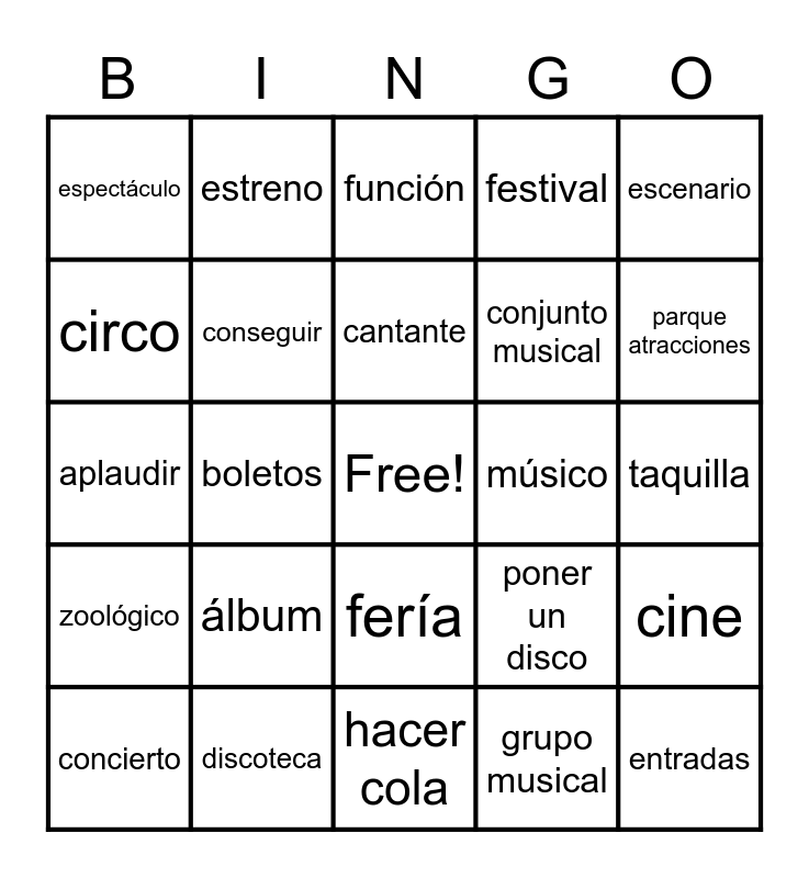 This bingo card has a free space and 24 words: concierto, álbum, cantante, grupo musical, escenario, espectáculo, estreno, función, músico, taquilla, aplaudir, conseguir, poner un disco, cine, circo, discoteca, hacer cola, festival, parque atracciones, zoológico, boletos, fería, conjunto musical and entradas.