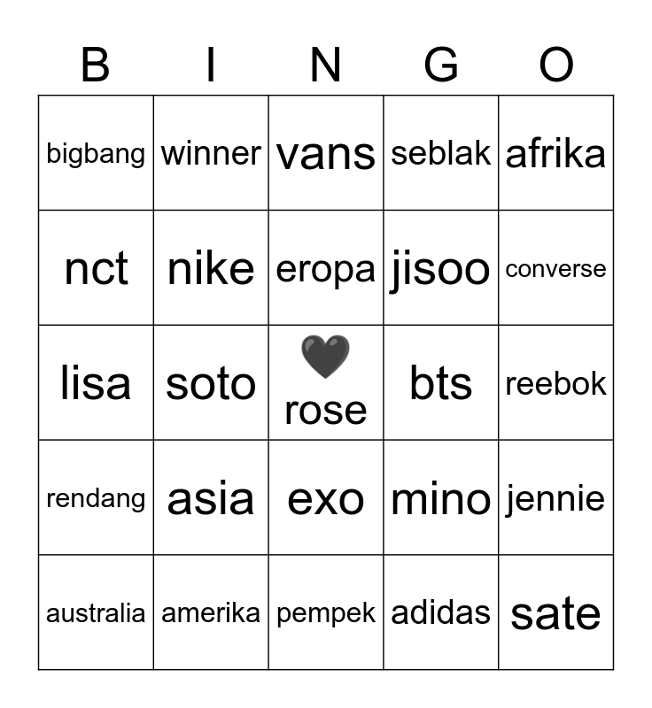 This bingo card has a free space and 24 words: asia, amerika, eropa, australia, afrika, bigbang, nct, winner, bts, exo, jisoo, lisa, mino, jennie, nike, adidas, reebok, vans, converse, soto, sate, rendang, seblak and pempek.