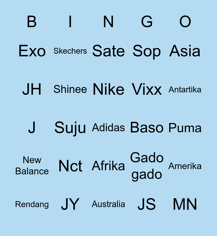This bingo card has a free space and 24 words: Nct, JY, Nike, Rendang, Asia, Exo, JH, Skechers, Baso, Afrika, Vixx, J, Gado gado, Amerika, Shinee, JS, Puma, Sate, Antartika, Suju, MN, New Balance, Sop and Australia.