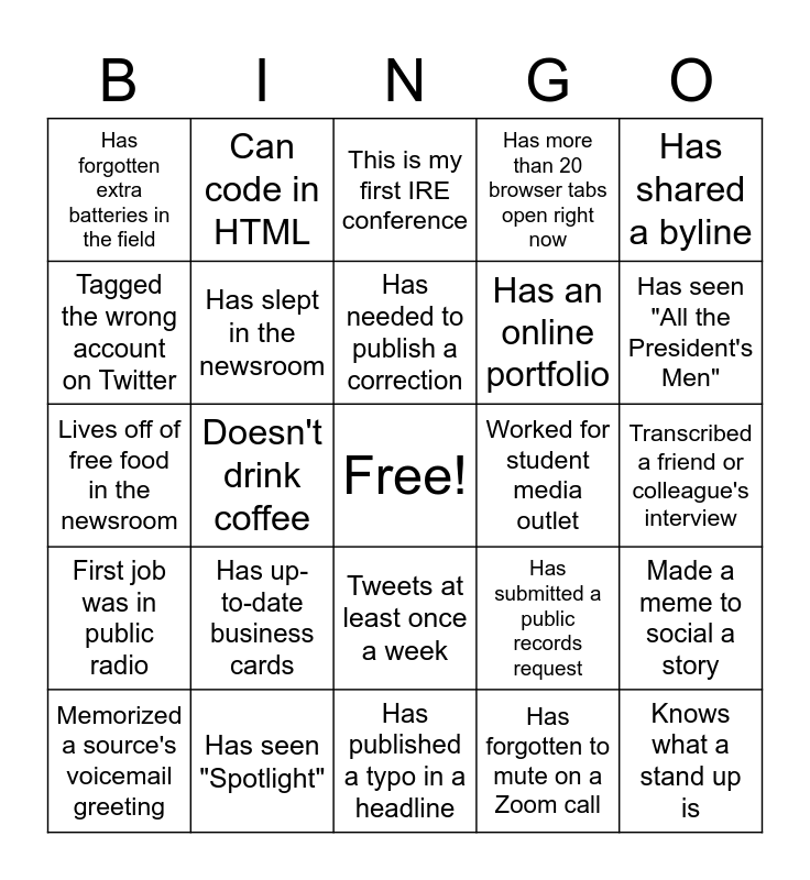 This bingo card has a free space and 24 words: Has up-to-date business cards, Has seen "Spotlight", Has needed to publish a correction, Memorized a source's voicemail greeting, Has shared a byline, Has forgotten extra batteries in the field, Tagged the wrong account on Twitter, Can code in HTML, Worked for student media outlet, Tweets at least once a week, Has an online portfolio, Lives off of free food in the newsroom, Has submitted a public records request, Made a meme to social a story, Has slept in the newsroom, Has forgotten to mute on a Zoom call, Transcribed a friend or colleague's interview, This is my first IRE conference, Has seen "All the President's Men", Doesn't drink coffee, Knows what a stand up is, First job was in public radio, Has more than 20 browser tabs open right now and Has published a typo in a headline.