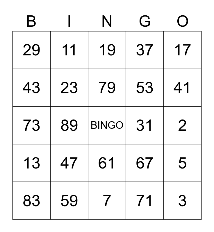 This bingo card has a free space and 24 words: 47, 59, 79, 83, 17, 29, 43, 11, 31, 61, 53, 73, 67, 5, 23, 71, 2, 19, 41, 89, 3, 13, 37 and 7.