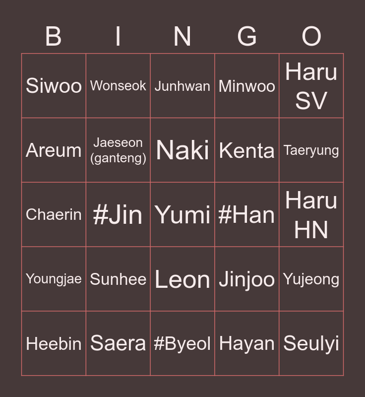 This bingo card has 25 words: Sunhee, #Byeol, Naki, Heebin, Haru SV, Siwoo, Areum, Wonseok, #Han, Leon, Kenta, Chaerin, Jinjoo, Yujeong, Jaeseon (ganteng), Seulyi, Haru HN, Junhwan, Taeryung, #Jin, Yumi, Saera, Youngjae, Minwoo and Hayan.