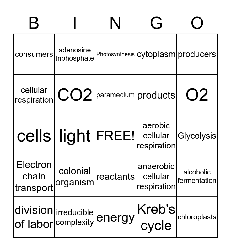 This bingo card has a free space and 24 words: colonial organism, irreducible complexity, paramecium, division of labor, producers, consumers, cellular respiration, adenosine triphosphate, aerobic cellular respiration, reactants, products, cells, anaerobic cellular respiration, alcoholic fermentation, CO2, Kreb's cycle, Glycolysis, Photosynthesis, O2, light, chloroplasts, Electron chain transport, cytoplasm and energy.