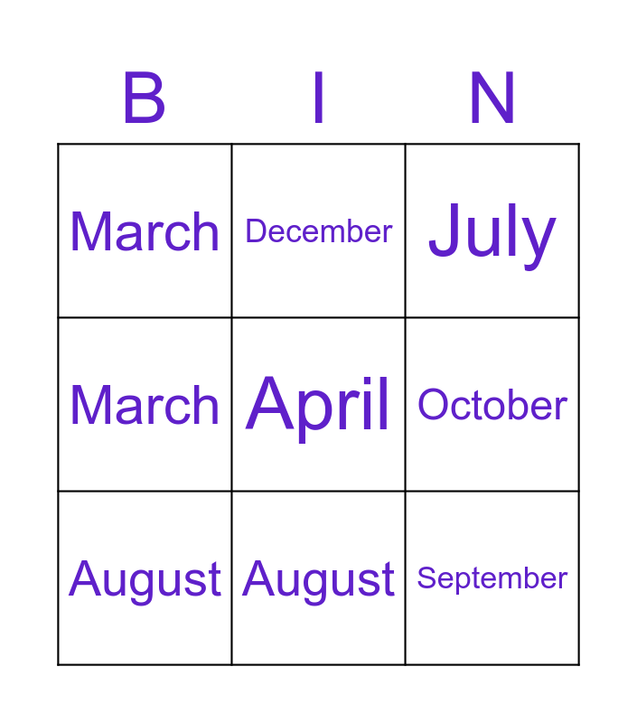 This bingo card has a free space and 15 words: January, May, July, March, August, September, February, June, October, July, November, March, August, December and April.