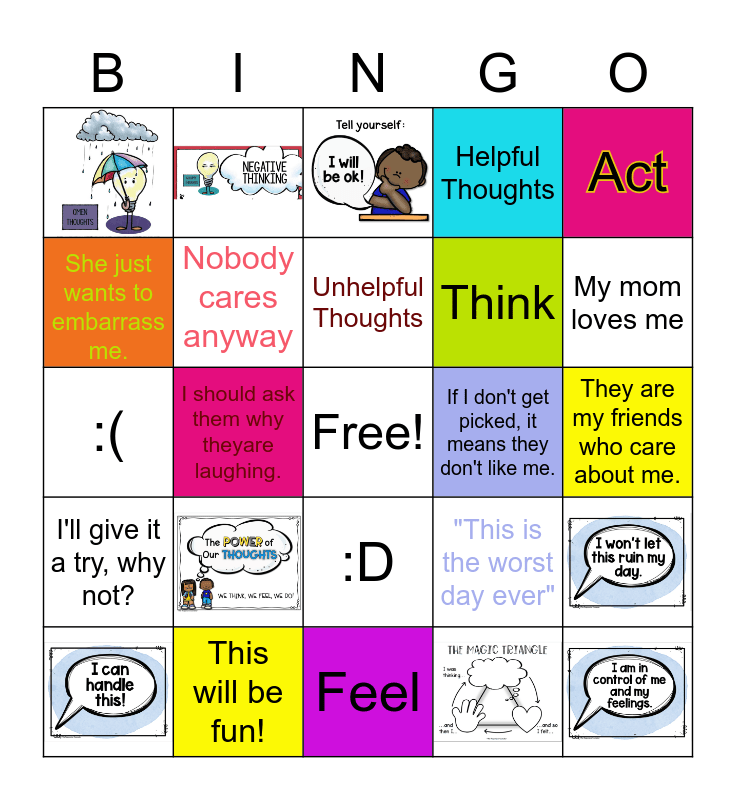 This bingo card has 8 images, a free space and 16 words: This will be fun!, Unhelpful Thoughts, Act, She just wants to embarrass me., If I don't get picked, it means they don't like me., :D, Think, :(, "This is the worst day ever", Nobody cares anyway, They are my friends who care about me., My mom loves me, I should ask them why theyare laughing., I'll give it a try, why not?, Helpful Thoughts and Feel.